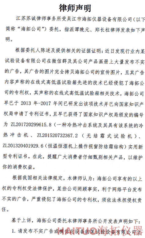 海拓儀器律師聲明:反對(duì)侵權(quán)行為 維護(hù)公司和消費(fèi)者權(quán)益摘要:國(guó)內(nèi)試驗(yàn)設(shè)備領(lǐng)先者吳江市海拓儀器設(shè)備有限公司委托律師事務(wù)所發(fā)布了律師聲明,該聲明指出,當(dāng)前市面上出現(xiàn)了產(chǎn)品專利侵犯海拓儀器權(quán)益,海拓儀器將以法律手段維護(hù)自身利益。該律師聲明要求某試驗(yàn)設(shè)備有限公司立即停止侵權(quán)行為,扯下其在網(wǎng)絡(luò)平臺(tái)的相關(guān)廣告和宣傳畫冊(cè)并同時(shí)停止生產(chǎn)同款設(shè)備。如果該設(shè)備公司不聽(tīng)勸解,海拓儀器將向人民法院依法起訴該公司侵權(quán)行為,以維護(hù)自身合法權(quán)益和維護(hù)客戶消費(fèi)權(quán)益,并建議廣大消費(fèi)者仔細(xì)甄別相關(guān)產(chǎn)品。? ? ? ?近日,吳江市海拓儀器設(shè)備有限公司委托律師事務(wù)所發(fā)布了律師聲明,該聲明指出,當(dāng)前市面上出現(xiàn)了產(chǎn)品專利侵犯海拓儀器權(quán)益,海拓儀器將以法律手段維護(hù)自身利益。??事件源起于海拓儀器發(fā)現(xiàn)市面上有同類設(shè)備公司通過(guò)完全拷貝海拓儀器產(chǎn)品宣傳圖片,在微信群及該公司產(chǎn)品畫冊(cè)上大量發(fā)布不實(shí)廣告。??聲明指出,該廣告聲稱的在線式高低溫試驗(yàn)箱的技術(shù)侵犯了海拓儀器的專利權(quán),該產(chǎn)品專利由海拓儀器 -